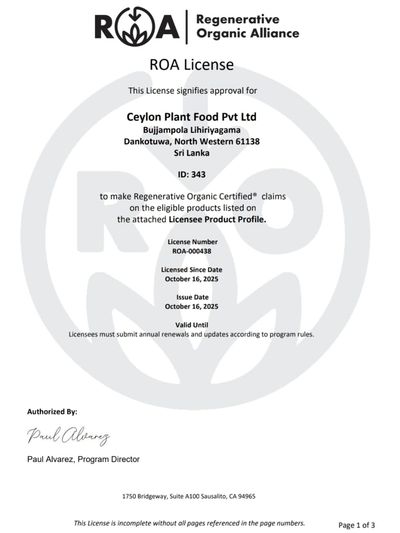 The Regenerative Organic Alliance (ROA) is a global certification body raising the bar for truly sustainable agriculture. By enforcing rigorous standards in soil health, biodiversity, animal welfare and farmworker fairness, ROA–certified products actively rebuild ecosystems, sequester carbon and support local communities. When you choose Ceylon Plant Food bearing the ROA seal, you’re not just feeding the plants you’re investing in healthier soils, stronger farms and a more resilient planet and lastly the finest Product.
